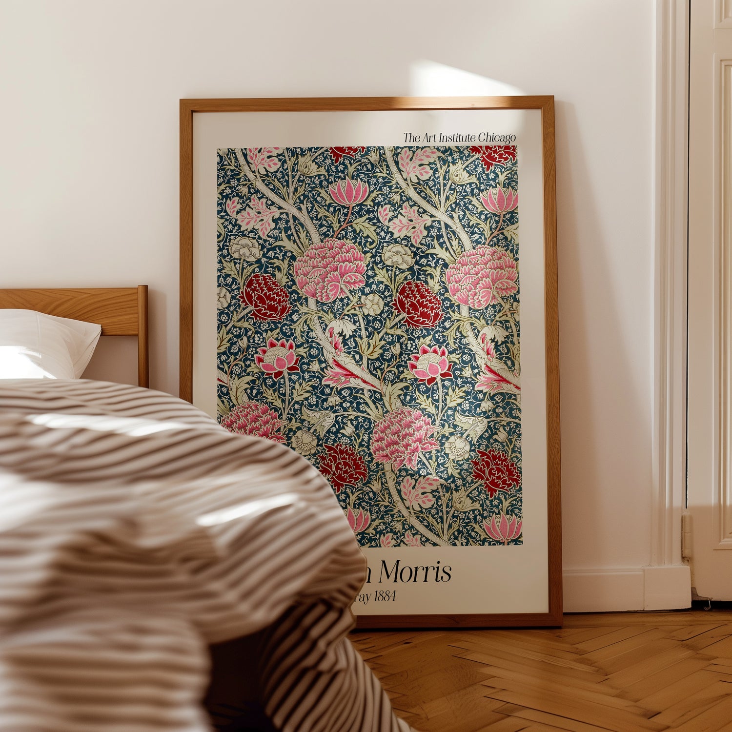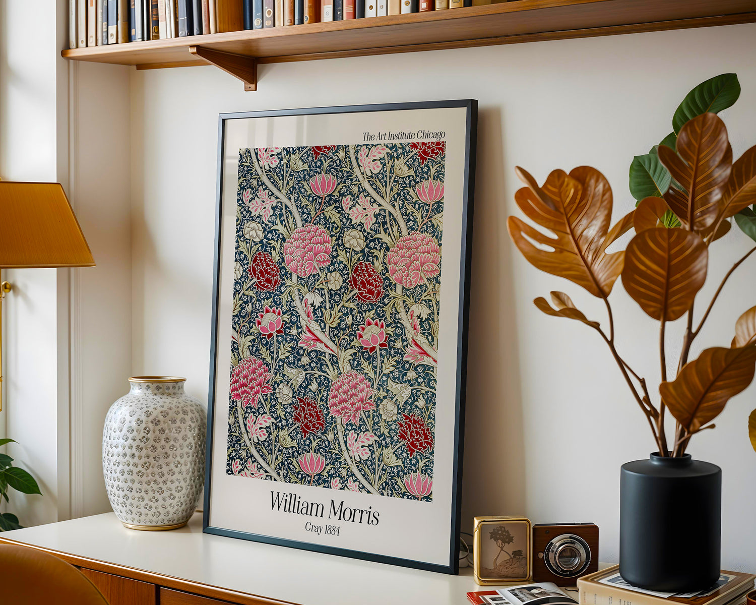 Cray – William Morris-poster brengt een klassiek ontwerp tot leven met rijk detail en zachte kracht. De sierlijke bloemen en kronkelende stelen vormen een gelaagd patroon dat blijft boeien. De combinatie van diepe roodtinten, roze accenten en een nachtblauwe achtergrond geeft het geheel een warme, bijna sprookjesachtige uitstraling. Ontworpen in 1884, maar nog altijd verrassend eigentijds. Deze kunstprint is ideaal voor wie houdt van natuurlijke vormen, rijke texturen en historische schoonheid.