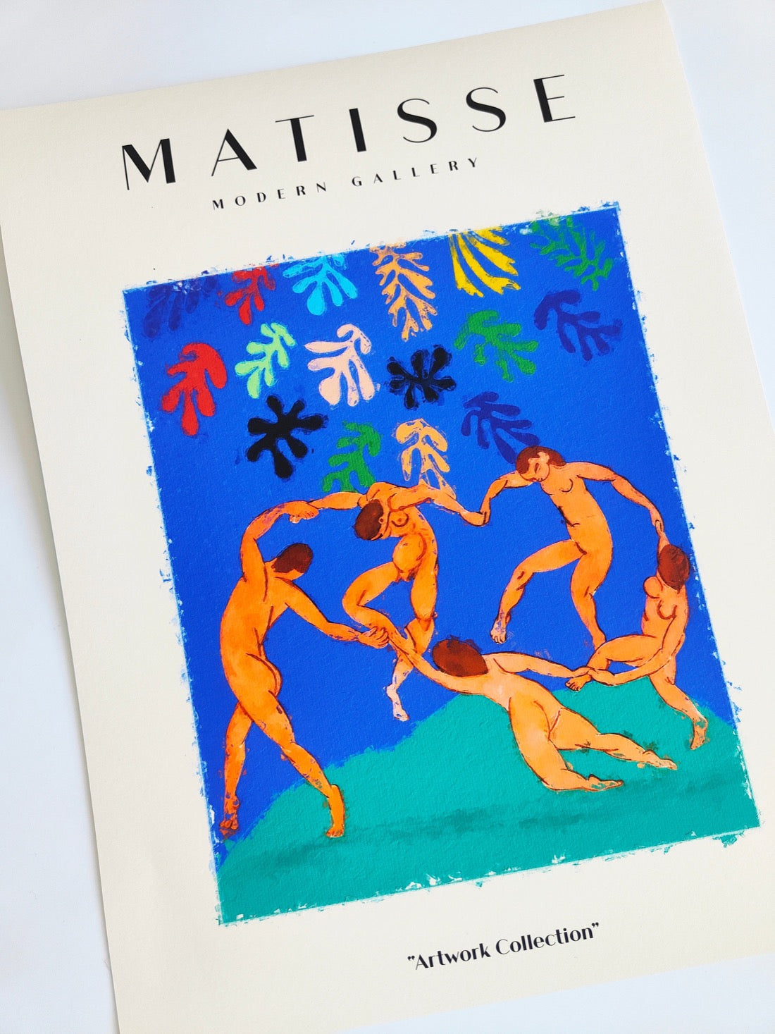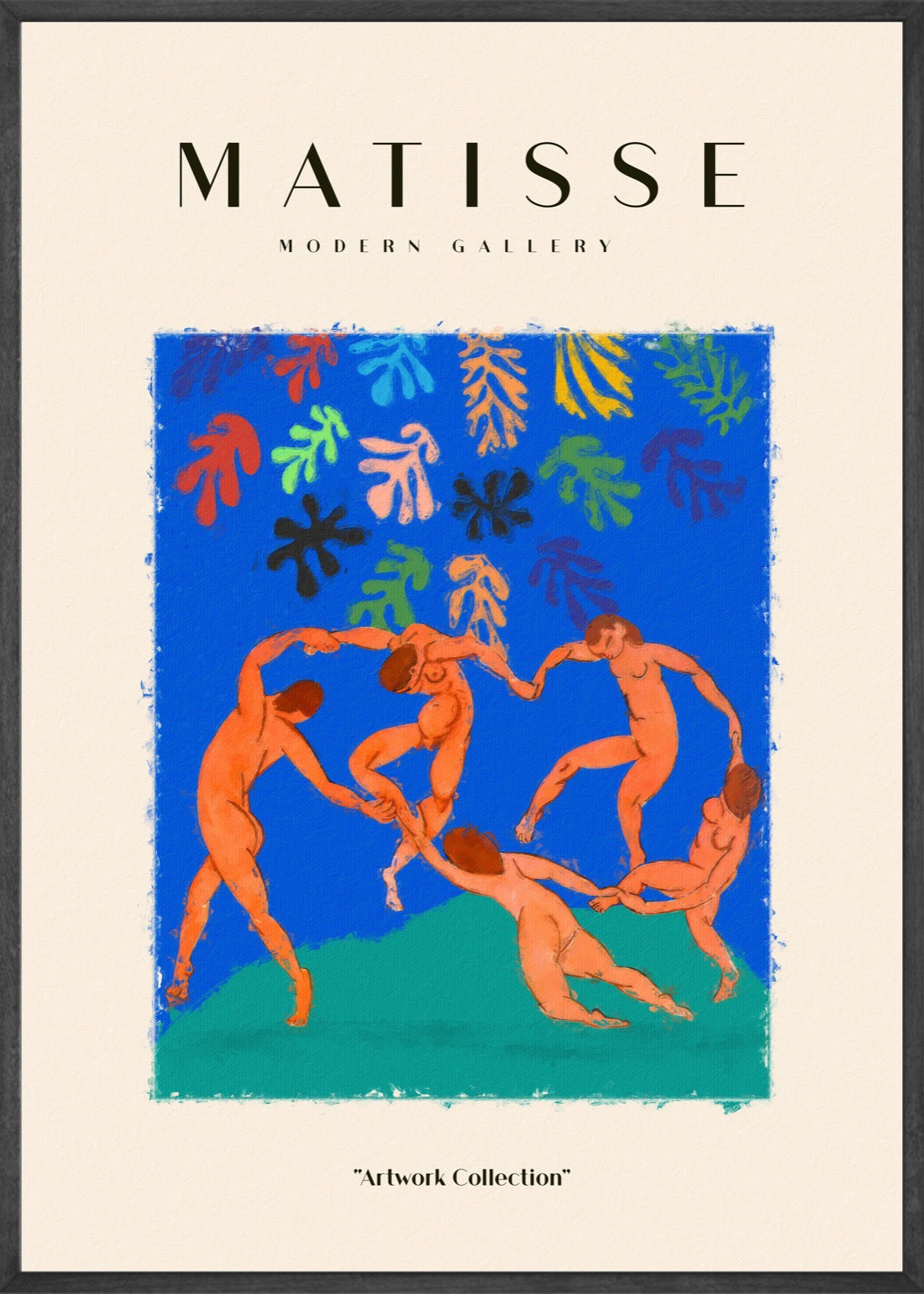 De poster toont een groep dansende figuren in een cirkel, geïnspireerd door de volksdansen van Matisse's reizen door Rusland en Noord-Afrika. De levendige kleuren en het gedurfde gebruik van vlakke, decoratieve vormen creëren een gevoel van dynamiek en energie die je niet onberoerd zal laten.