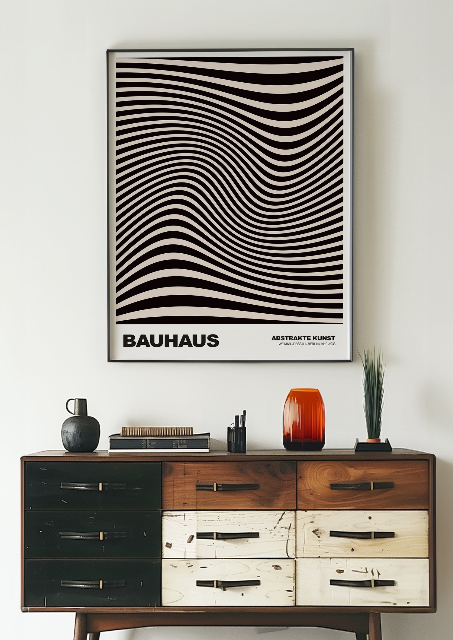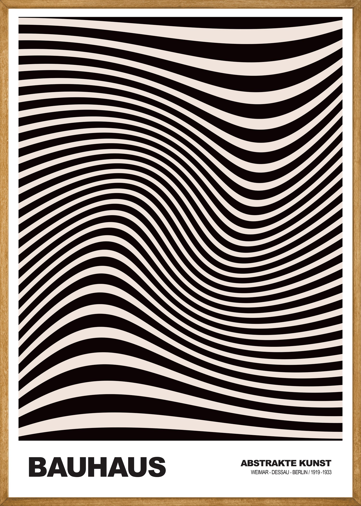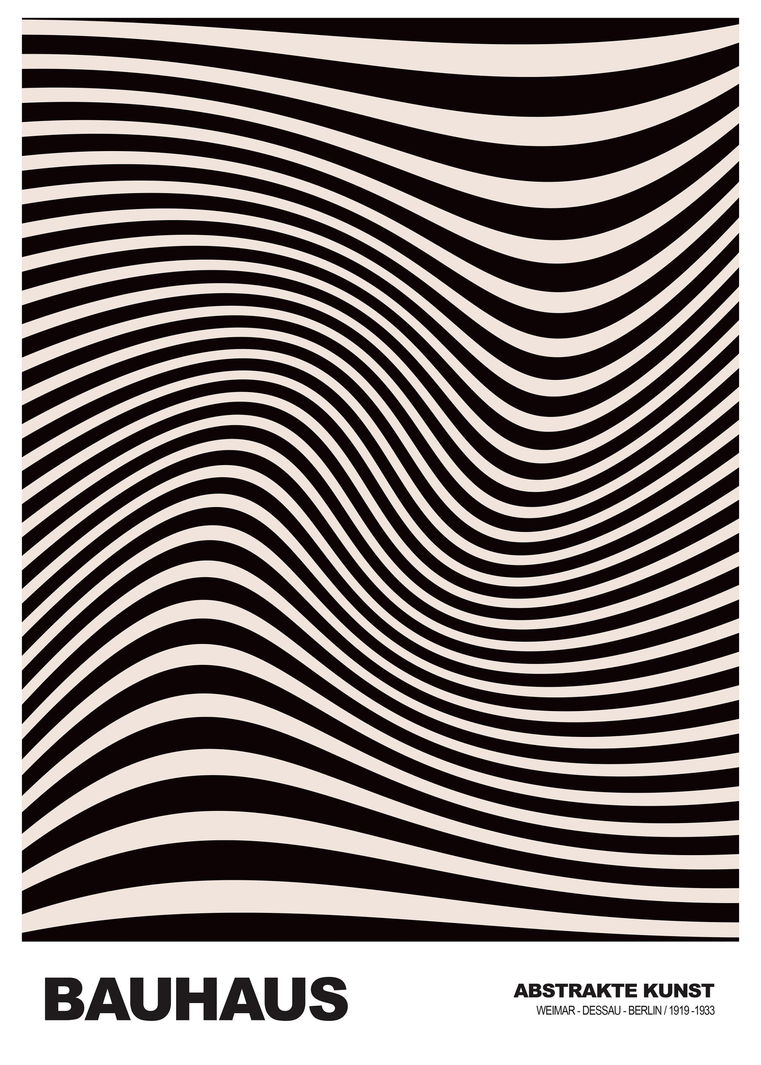 Diepe Golf Bauhaus poster is een grafisch kunstwerk dat beweging en rust in één beeld vangt. De zwarte lijnen lijken zich in golven over het vlak te buigen en creëren een optisch effect dat diepte en richting suggereert. De vloeiende vormen geven de poster een dynamische uitstraling, terwijl het zwart-wit contrast zorgt voor balans en eenvoud. Deze minimalistische wanddecoratie is geïnspireerd op de Bauhaus-stijl en past perfect in een modern interieur. Tijdloos en visueel krachtig—een kunstposter die blijft fascineren.