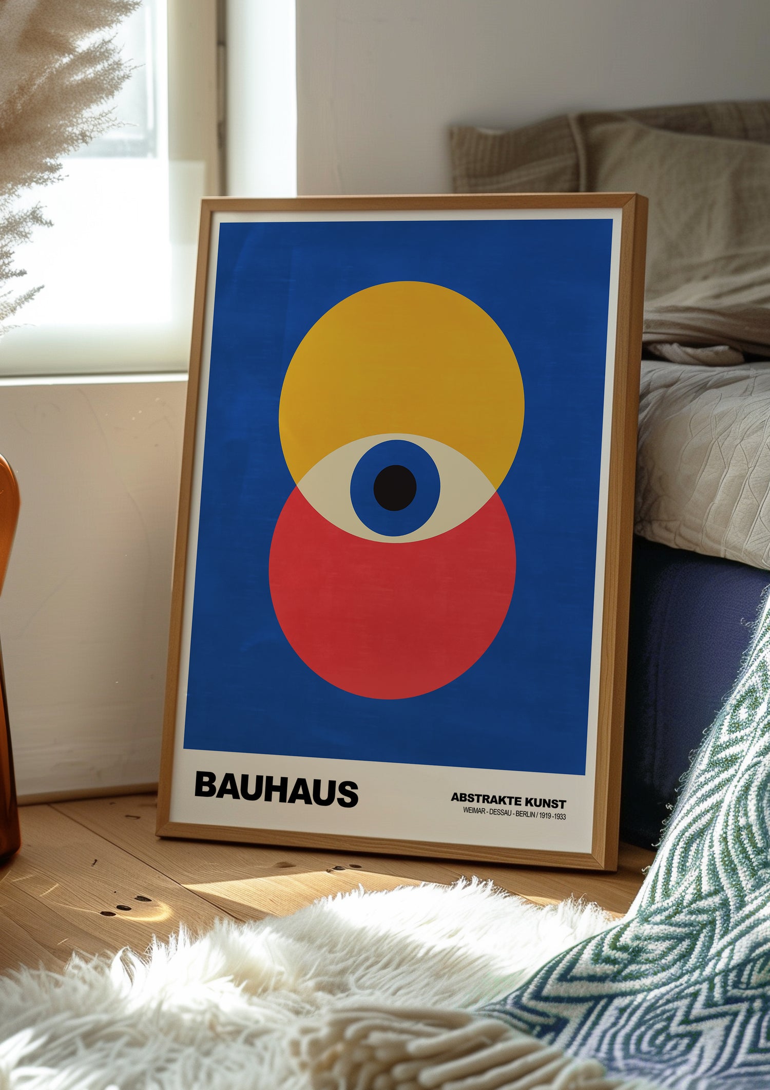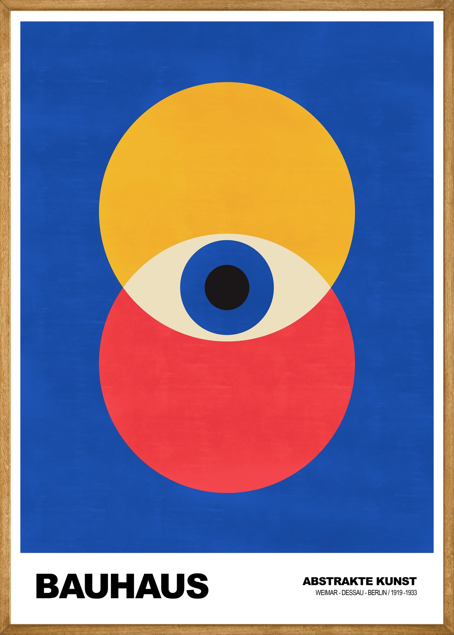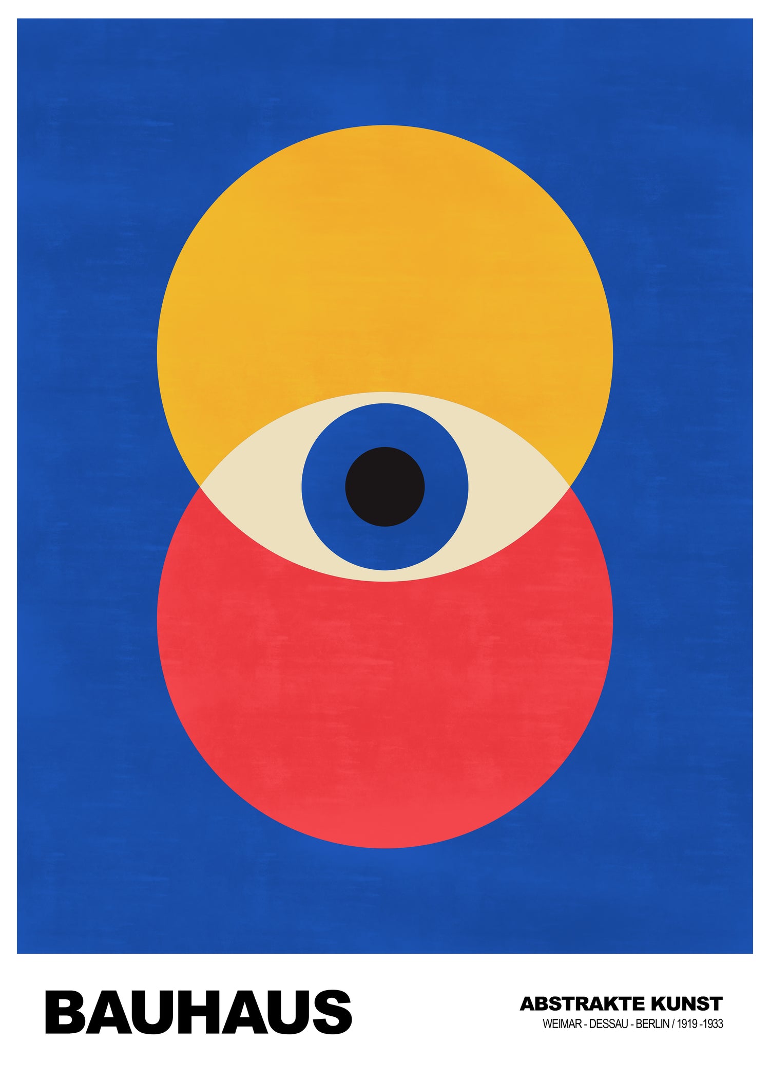Evenwichtige Blik – Bauhaus-poster heeft een heldere, krachtige uitstraling. Het ontwerp bestaat uit grote geometrische vormen in geel en rood, die samen een oog vormen tegen een diepblauwe achtergrond. De kleuren zijn opvallend, maar in balans, en brengen rust én energie in je interieur. Deze moderne wanddecoratie is geïnspireerd op de Bauhaus-stijl, waarin eenvoud en kleur samenkomen in een sterk visueel beeld. Een poster die zowel strak als speels is—perfect voor een eigentijdse ruimte.