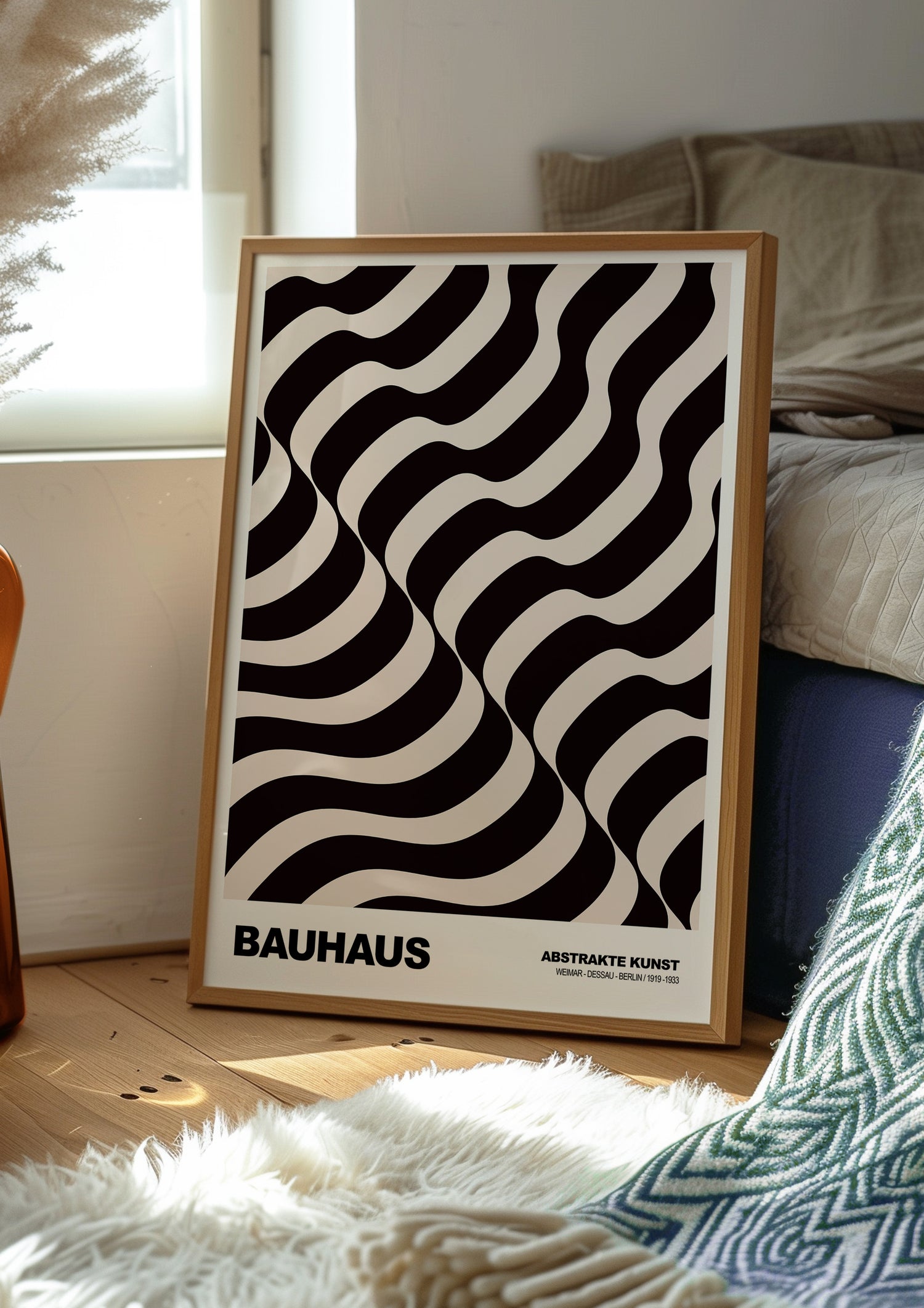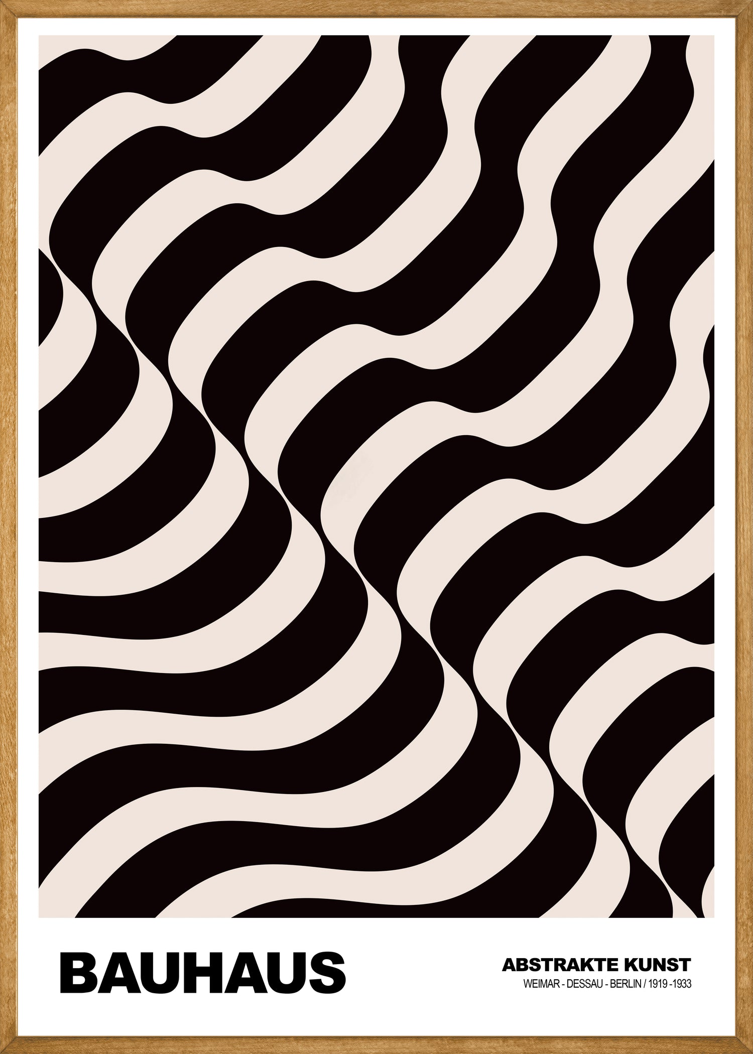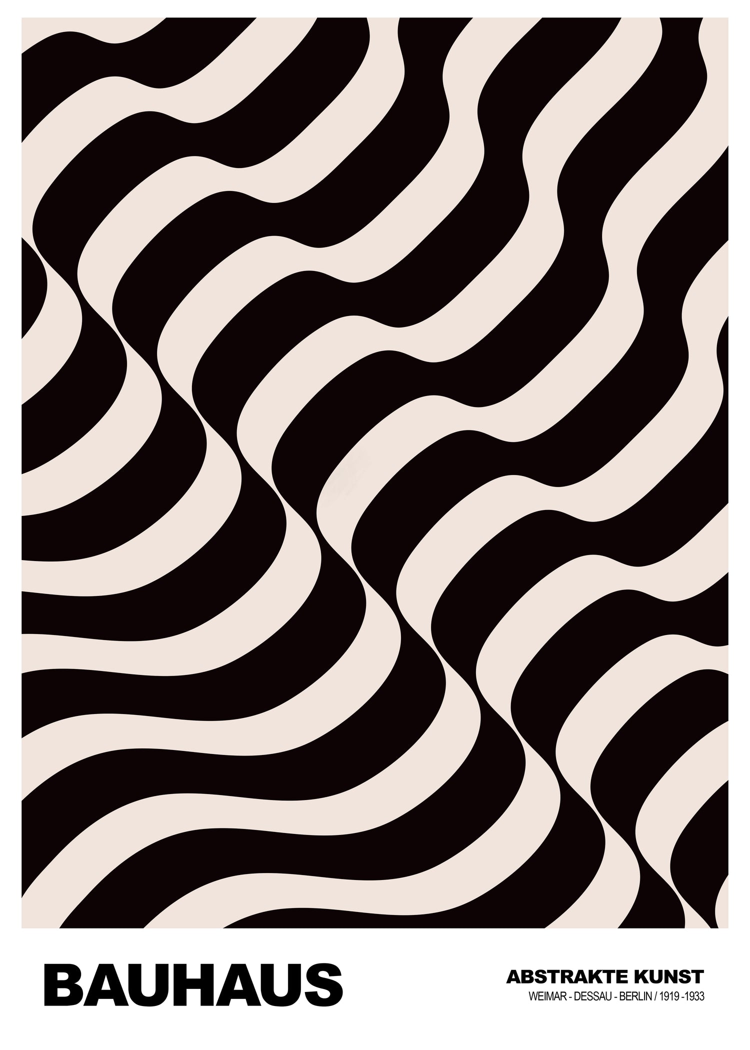 Golvend Zicht Bauhaus poster brengt een krachtig ritme in zachte beweging. De zwarte en beige lijnen slingeren over het vlak in een vloeiende golf die rust én energie uitstraalt. Het abstracte lijnenspel geeft een optisch effect dat blijft verrassen, zonder druk te worden. Geïnspireerd op de Bauhaus-stijl is deze poster minimalistisch, grafisch en uitgesproken. Een moderne wanddecoratie die balans brengt in een ruimte, en tegelijk de aandacht trekt met zijn dynamische vorm.