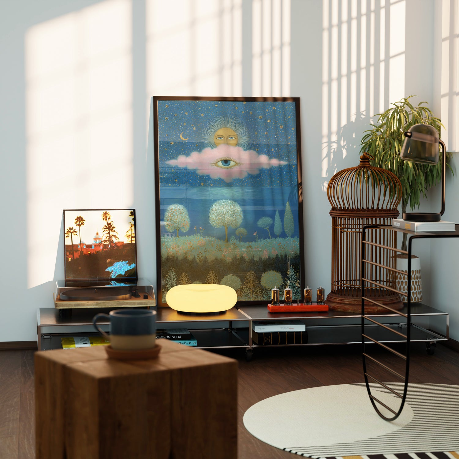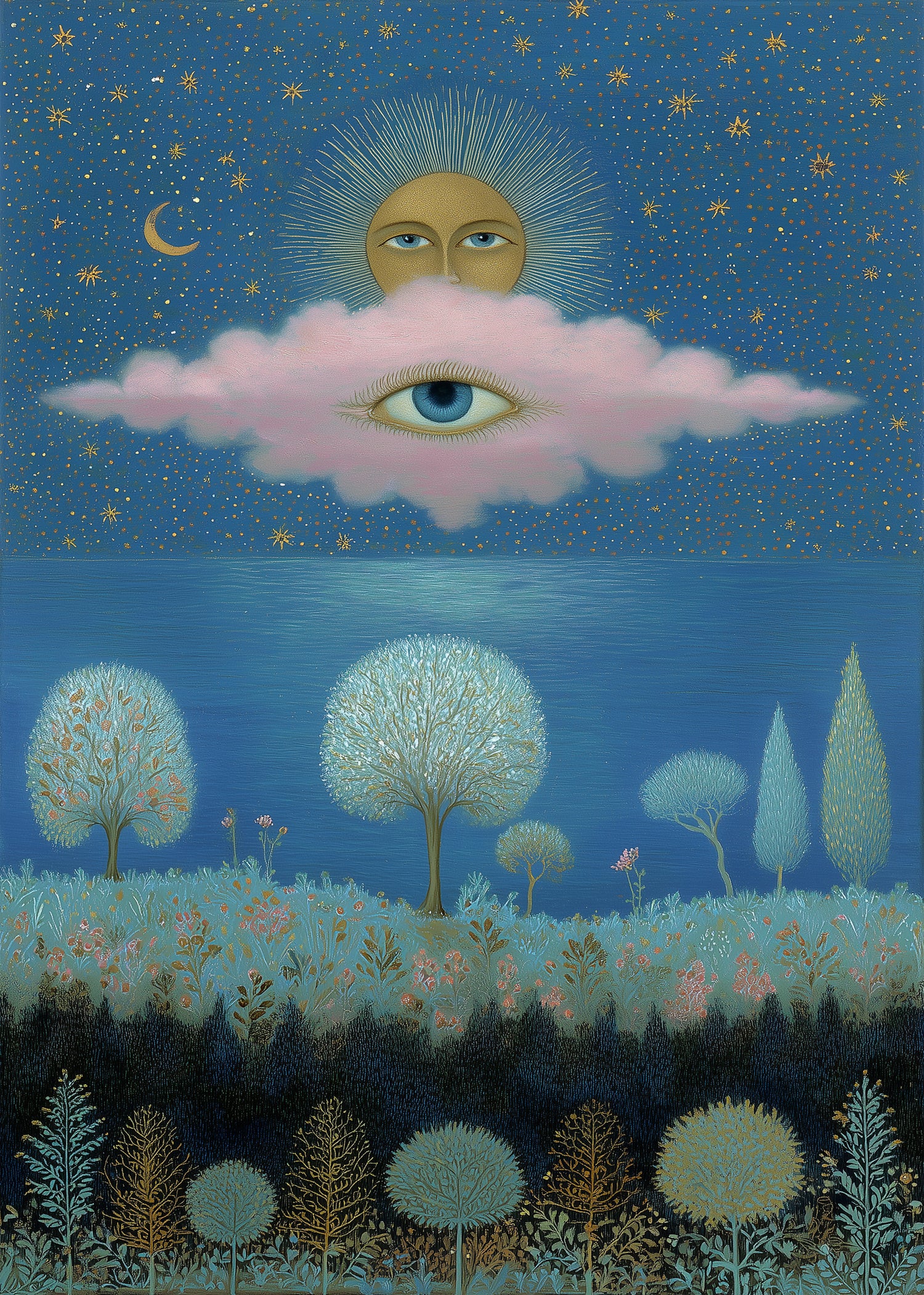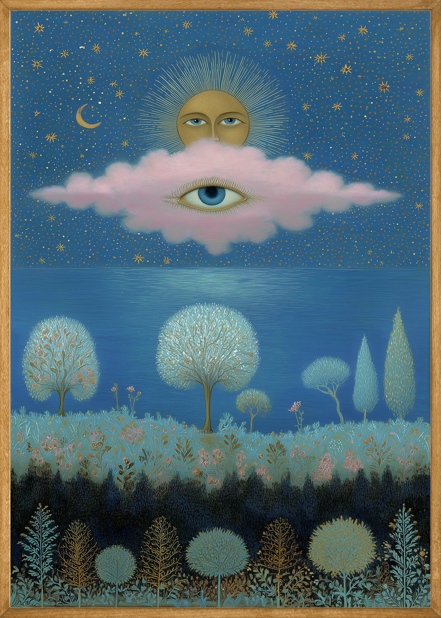In dit mythische landschap komen zon, maan en sterren samen in een betoverend geheel. Hoog boven de bomen verschijnt een wolk met een oog dat waakt over het tafereel, terwijl het licht van de zon en de stilte van de nacht elkaar ontmoeten in dezelfde hemel.