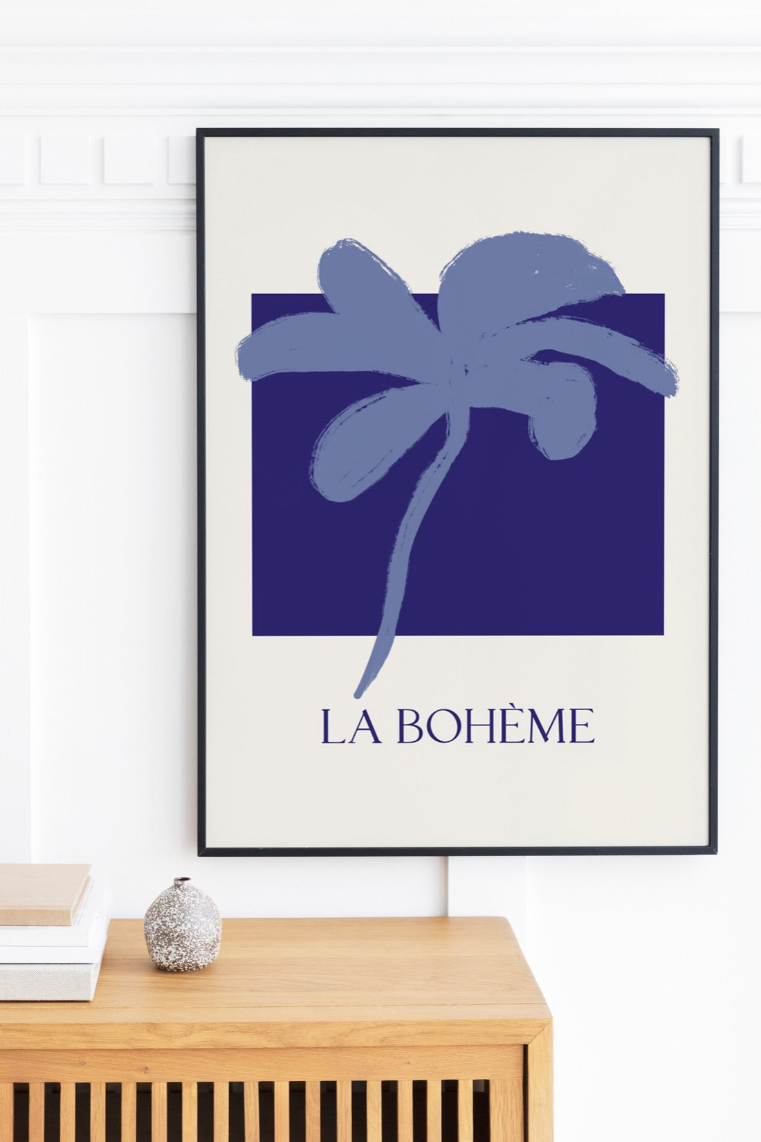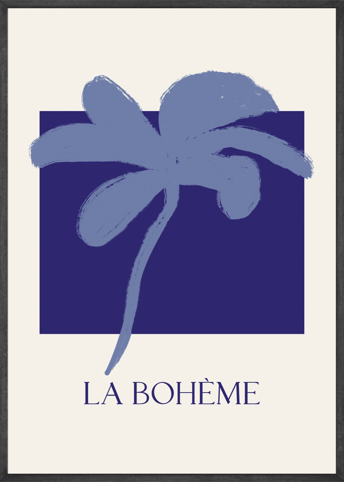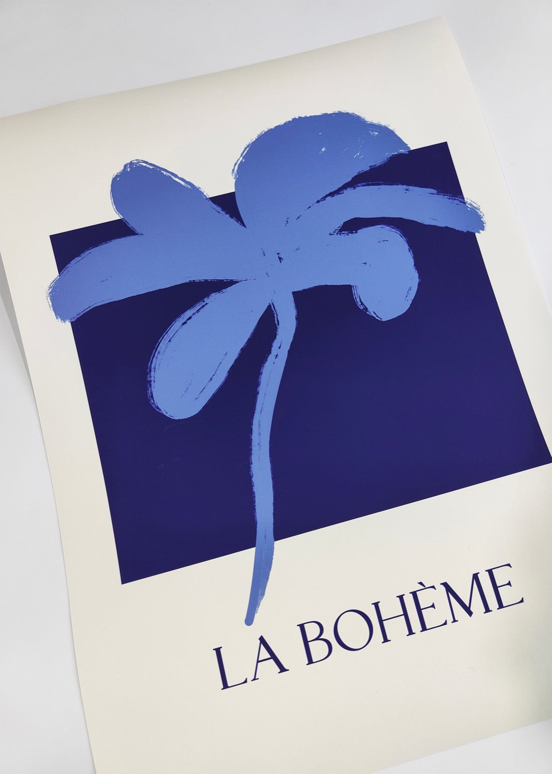 prachtige poster met een illustratie van een Blauwe Bloem- vorm op een donker blauwe achtergrond, met tekst ‘La Boheme’ aan de onderkant.