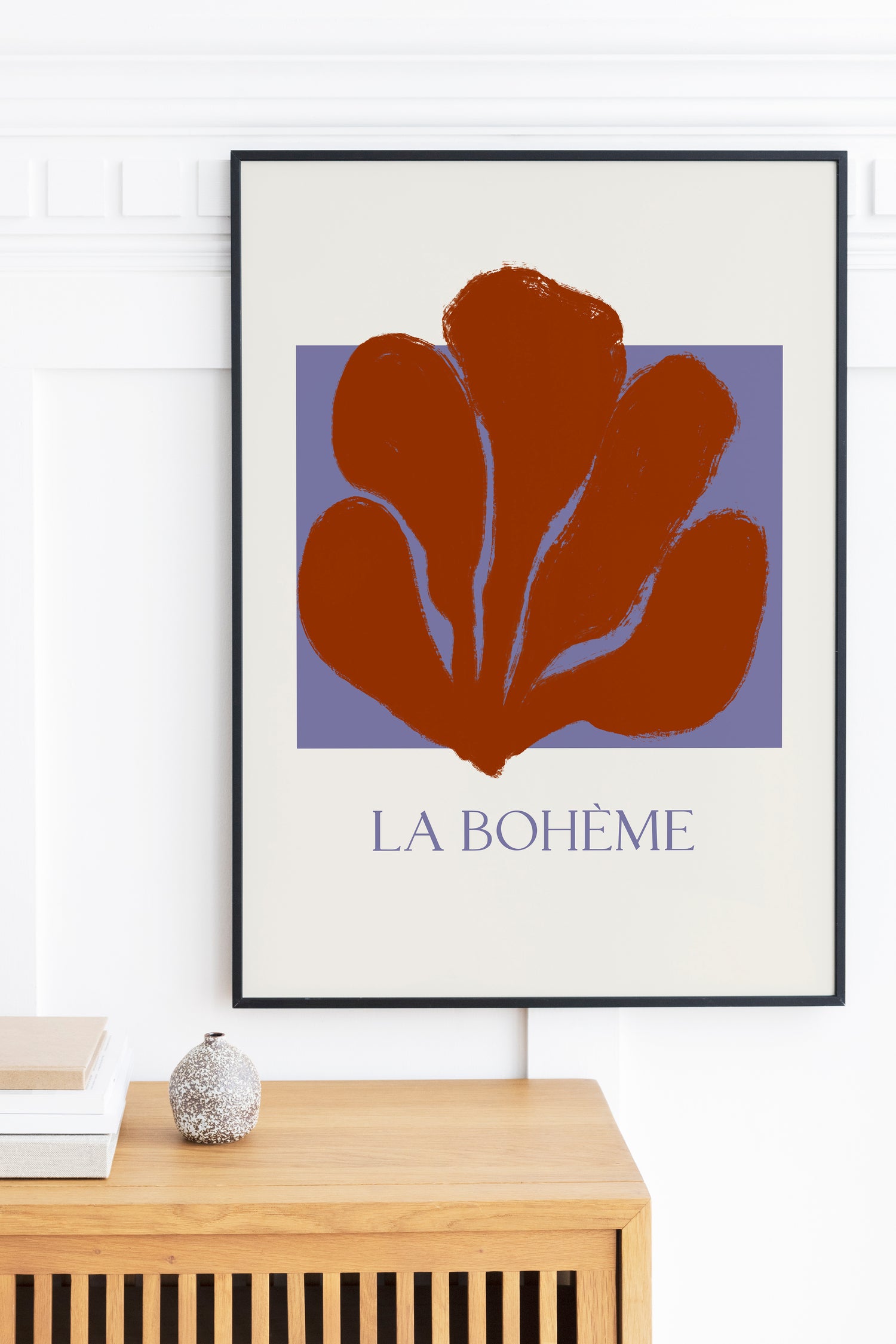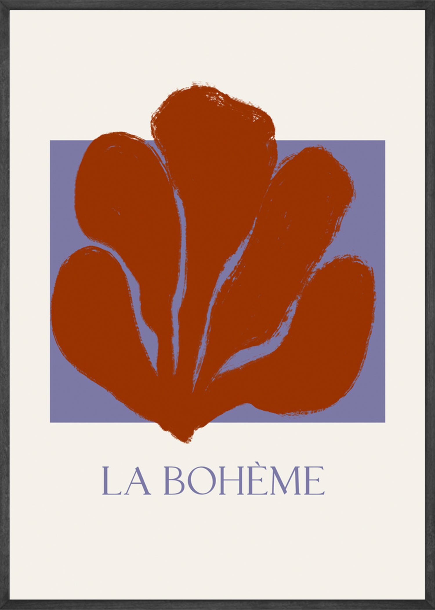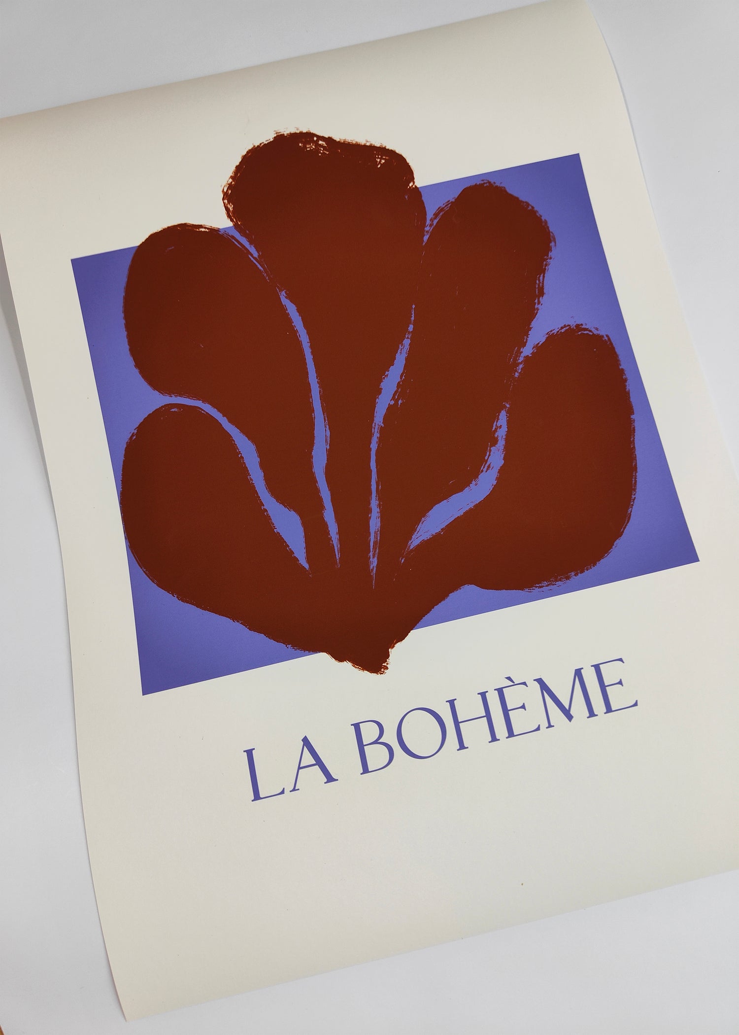 prachtige poster met een illustratie van een roodbruine plant- vorm op een helderblauwe achtergrond, met tekst ‘La Boheme’ aan de onderkant.