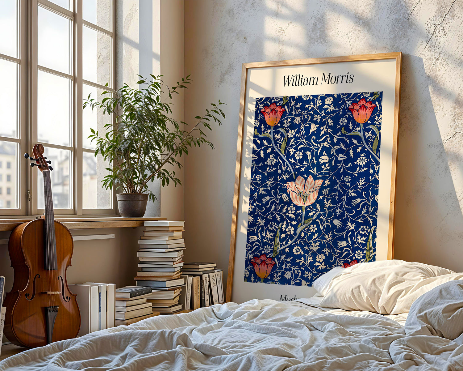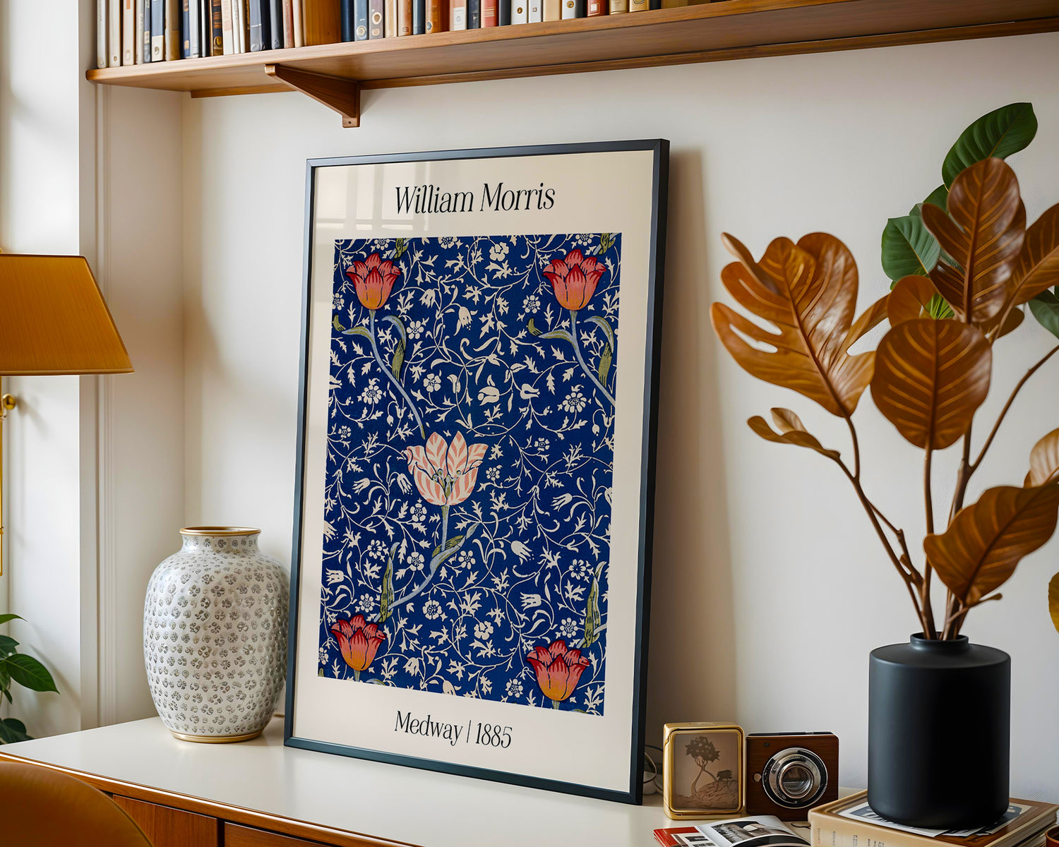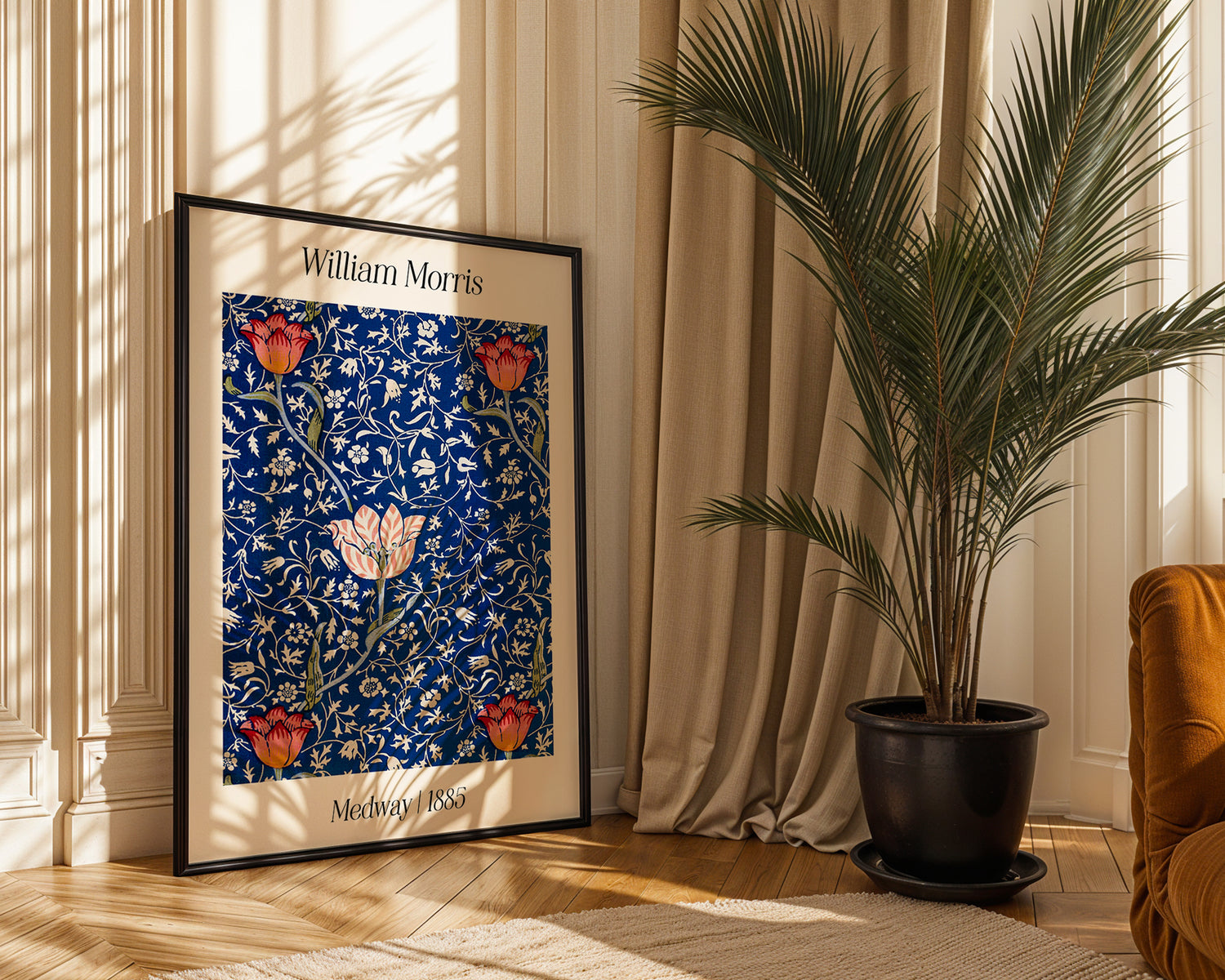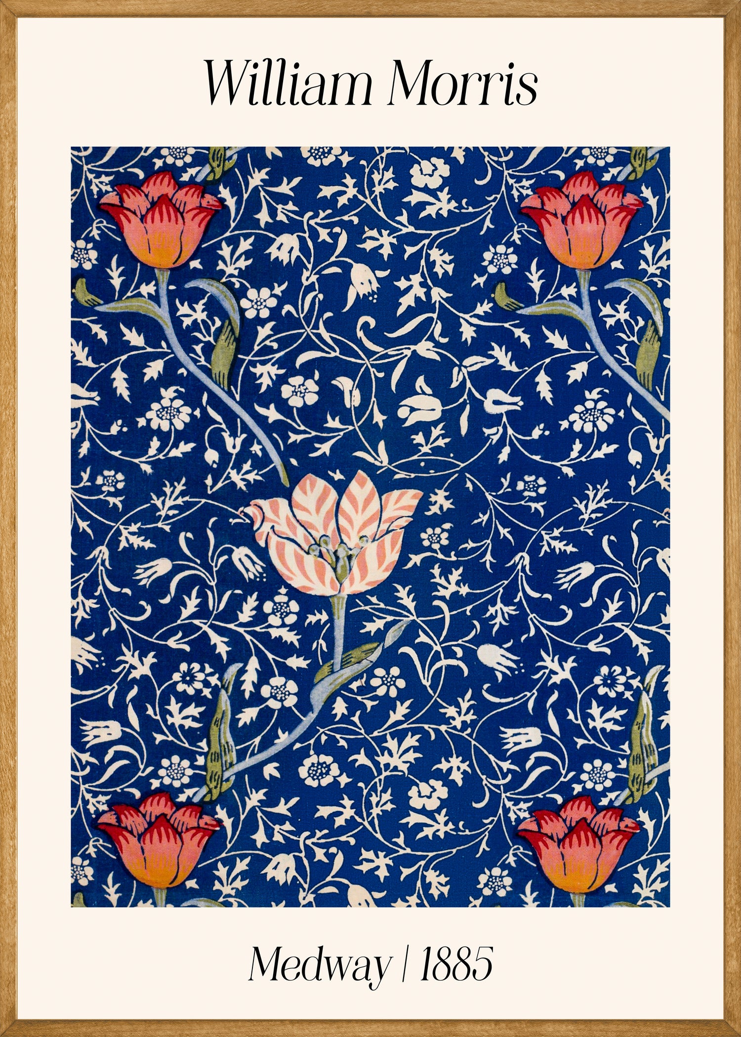 Medway William Morris Poster is een bloemrijk patroon vol ritme en elegantie. Grote tulpvormen in warme oranjerood en zachtroze steken af tegen een diepblauwe achtergrond vol fijne witte ranken. Het lijnenspel is speels en verfijnd, met een natuurlijke flow die het oog blijft volgen. Ontworpen in 1885 en nog altijd krachtig in z’n eenvoud. Deze kunstprint brengt een lichte, heldere sfeer in elke ruimte — ideaal voor wie houdt van klassieke patronen met een eigentijdse uitstraling. Tijdloos, sierlijk en verrassend helder.