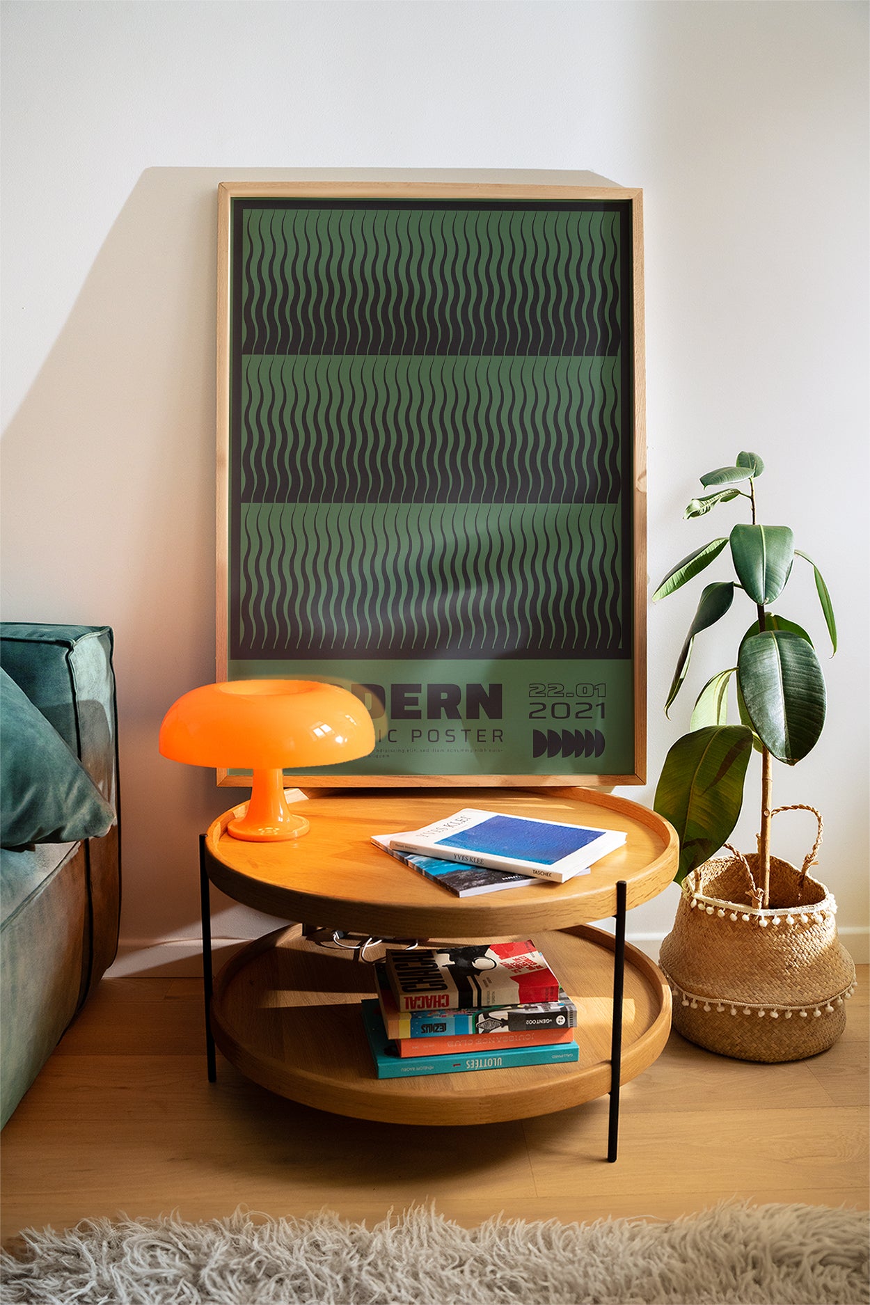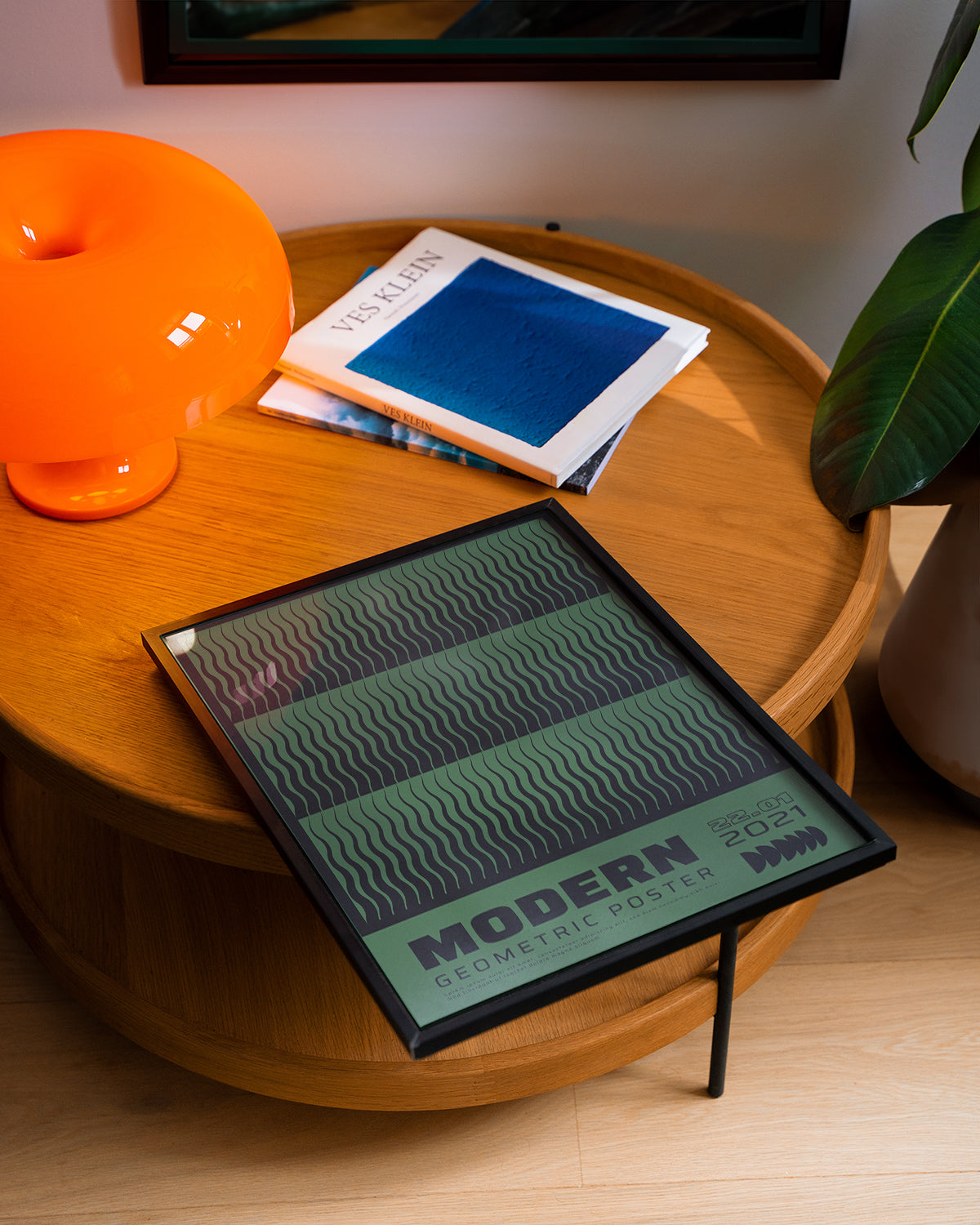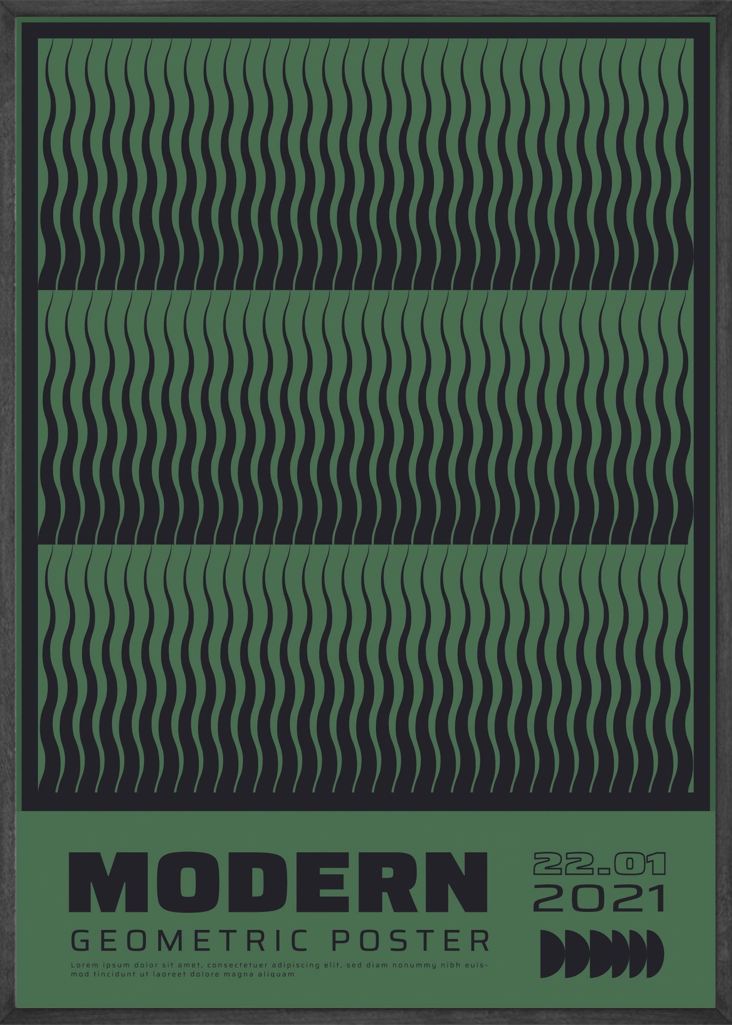 De Modern Geometric, Green & Black Poster combineert golvende lijnen met een krachtig groen-zwart contrast. Het ontwerp bestaat uit ritmische groene golven op een diepe zwarte achtergrond, wat zorgt voor een vloeiend en dynamisch effect. De herhaling van de vormen creëert een visueel patroon dat direct de aandacht trekt en elke ruimte een moderne, grafische uitstraling geeft.