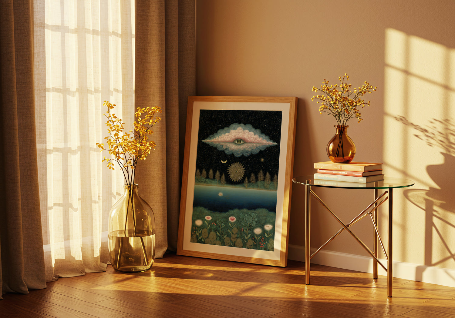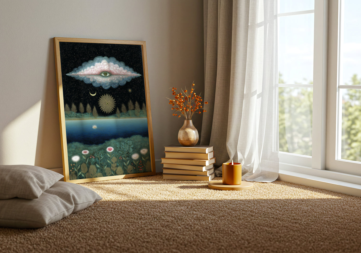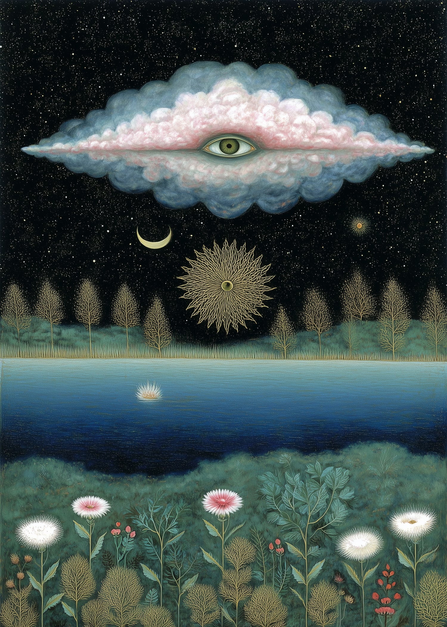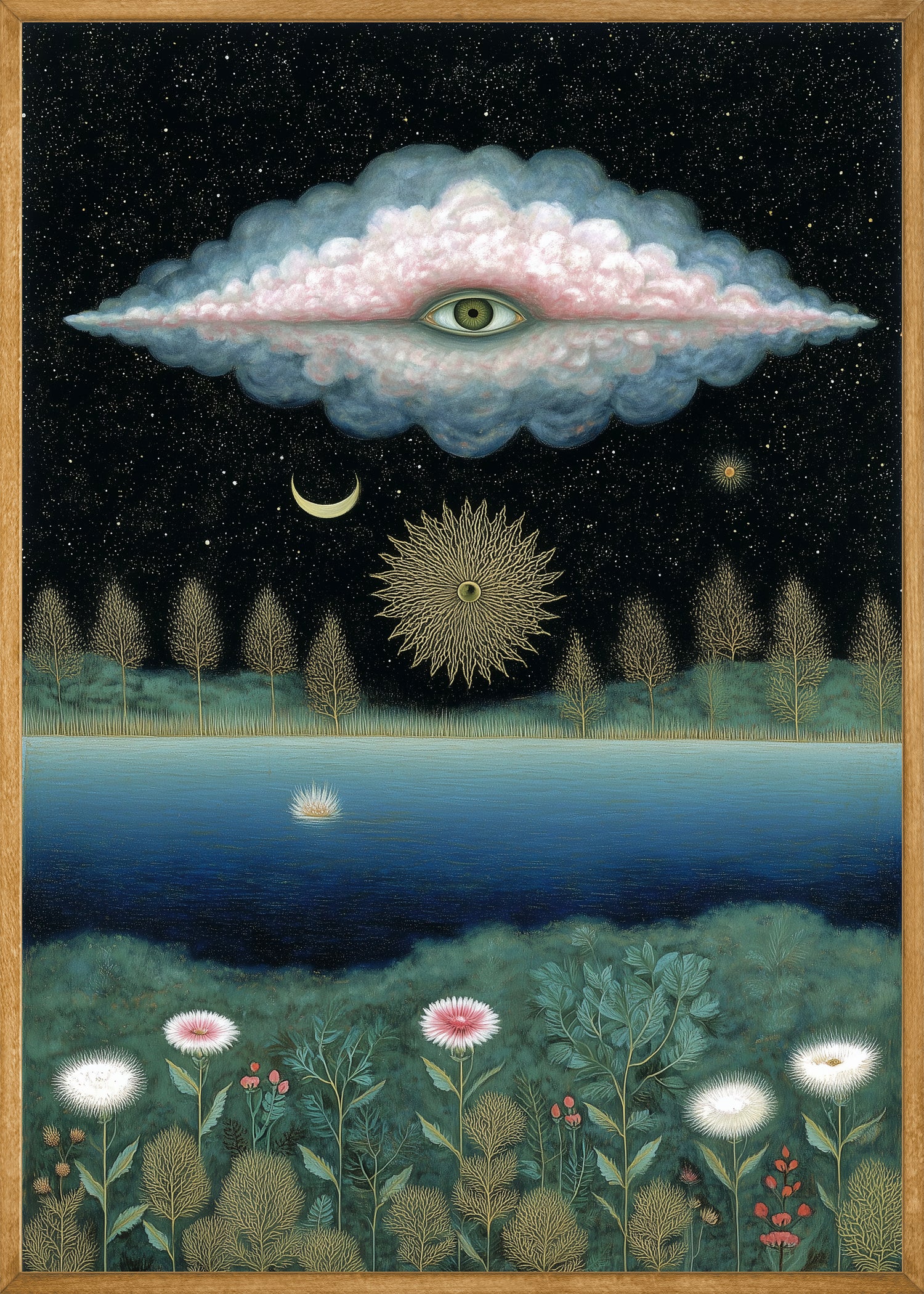 Aan de rand van de oever ontvouwt zich een mythisch landschap met bloemen in volle bloei, een stille waterkant en een rij bomen die oprijzen tegen de nachtelijke hemel. Hoog boven dit tafereel zweeft een wolk met een oog, geflankeerd door de maan en talloze fonkelende sterren.